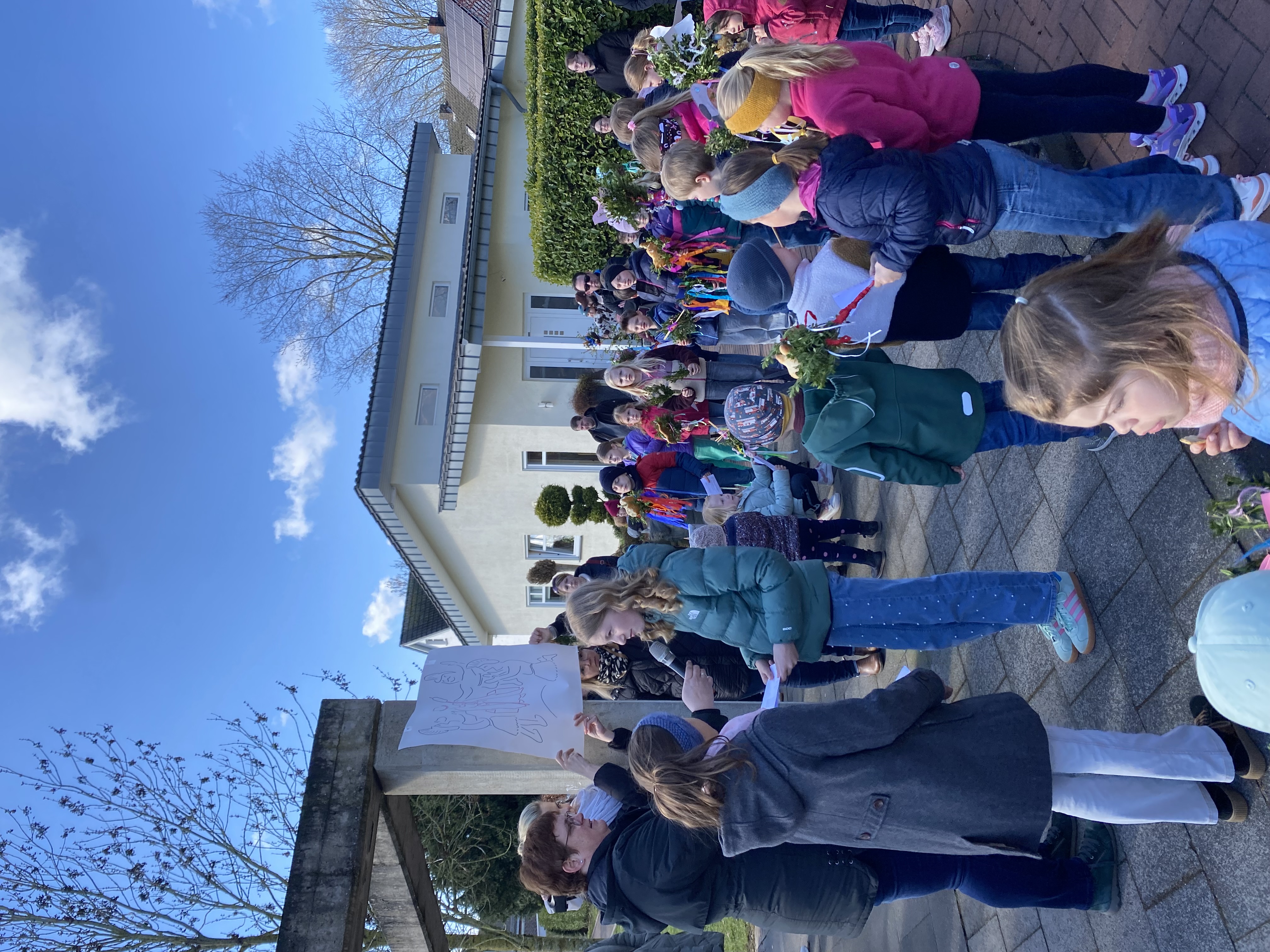 Der Gottesdienst begann vor dem Laurentius-Haus. Dort war bereits ein kleiner Altar aufgebaut. Nach der Begrüßung segnete Pfarrer Ahls die Palmzweige. Nach dem Evangelium zog die Gemeinde bei strahlendem Sonnenschein in einer großen Prozession zur St. Laurentius-Kirche. Unterwegs wurde an mehreren Stationen von den diesjährigen Kommunionkindern die Leidensgeschichte Jesu vorgetragen. Unser Jugendorchester begleitete die Prozession bis zur Kirche.
